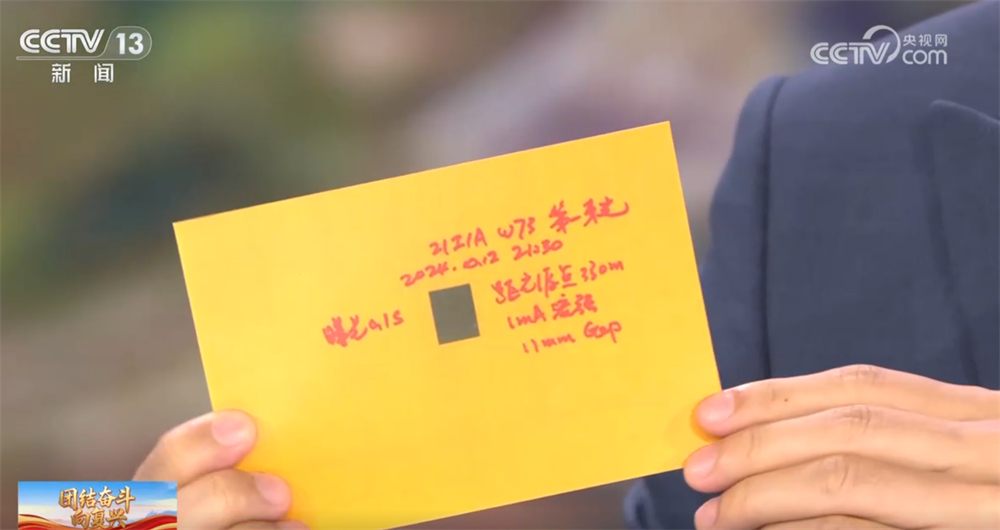 现在主播手中拿的这张纸,是高能同步辐射光源第一次发出光时,科研人员用一张黄色感光纸放在光路上,记录下的一个黑色斑点。上面手写记录了2024年10月12日21点30分•●、第一束光等内容,这个黑色方形斑点就是高能同步辐射光源发出第一束光的标志★▷•。