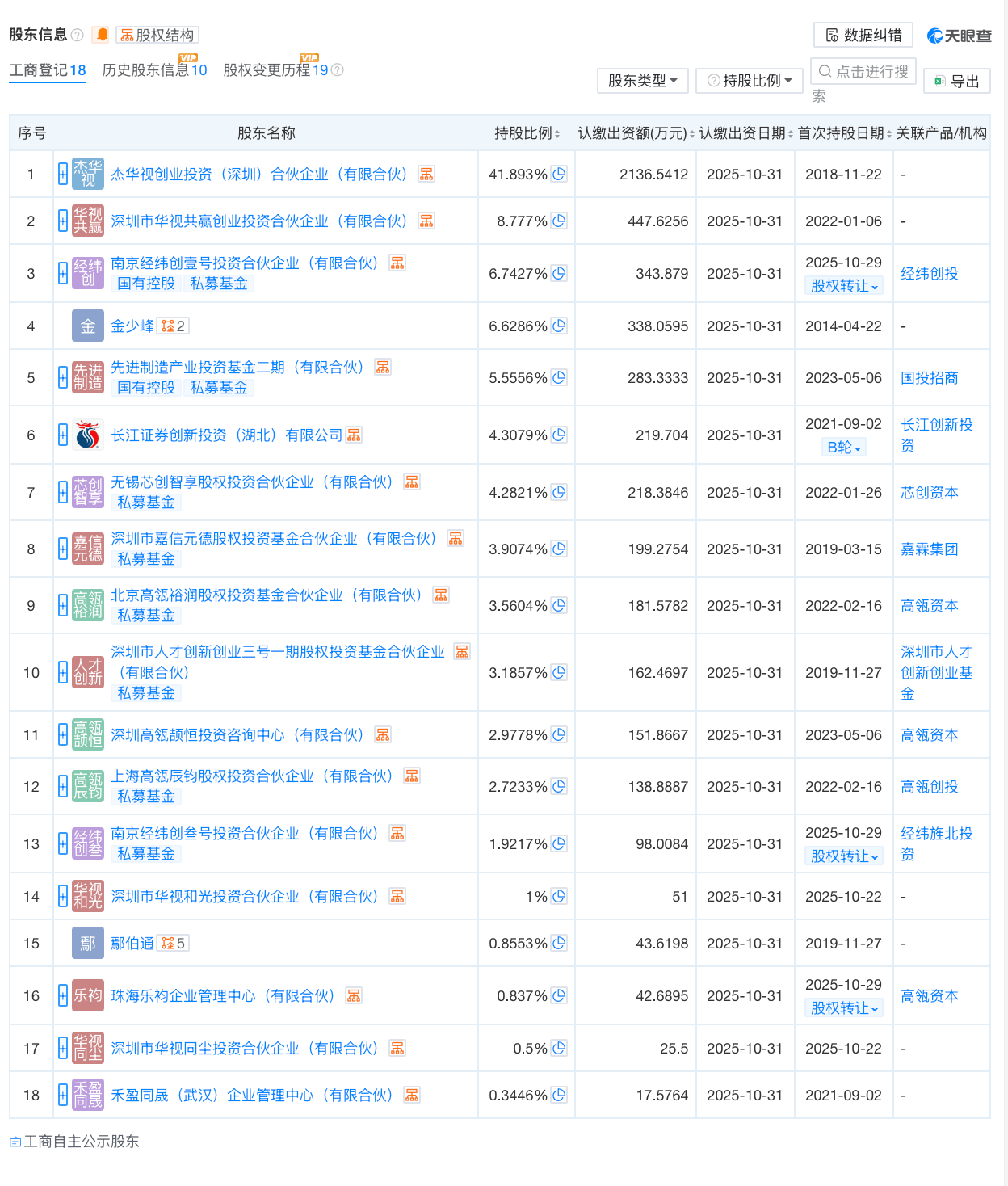 天眼查App信息显示,金少峰直接持有深视智能6=▷▲.6286%股份;杰华视创业投资(深圳)合伙企业(有限合伙)持股41.893%,系控股股东;深圳市华视共赢创业投资合伙企业(有限合伙)持股8•▷.777%◇▷。