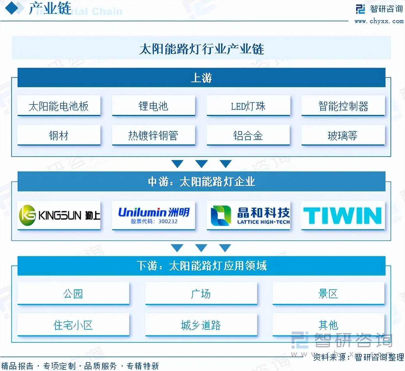 太阳能路灯产业链主要包括上游原材料供应□◁◆、中游的制造和组装以及下游应用。上游原材料主要包括太阳能电池板、锂电池、LED灯珠、智能控制器、钢材•、热镀锌钢管▽▷◇、铝合金、玻璃、塑料等。产业链中游为太阳能路灯的制造和组装环节=。产业链下游为应用领域,包括公园、广场、景区、住宅小区、城乡道路等场所■。