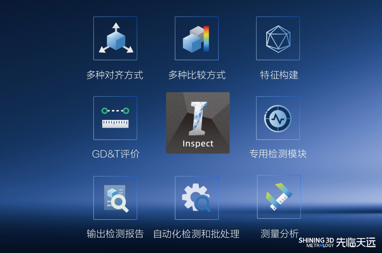SHINING3D Inspect集成了强大的三维数据获取与三维检测功能,可以实现扫描与检测任务的无缝灵活切换,支持扫描坐标对齐、数据补全、检测重计算等关键逻辑,并且具备多种对齐方式、多种比较方式、特征构建、GD&T评价、测量分析、专用检测模块、输出检测报告、自动化检测和批处理。