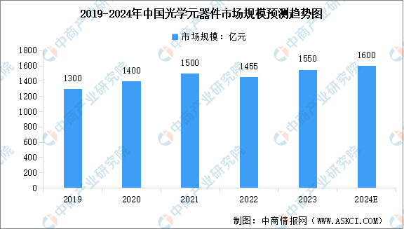 光学元器件被誉为人工智能、物联网、数字经济等新兴信息技术的“眼睛”。在宏观环境及疫情影响下,2022年度光学元器件的主要应用领域如消费电子、安防监控、工业制造等的市场需求下滑,光学元器件的整体市场规模近十年内首次出现下滑。中商产业研究院发布的《2024-2029年中国光学元器件行业市场前景预测与发展趋势研究报告》显示,2022年度国内光学镜片、镜头及模组等元器件的市场规模为1455亿元,同比下滑3%。中商产业研究院分析师预测,2024年中国光学元器件市场规模将恢复至1600亿元。