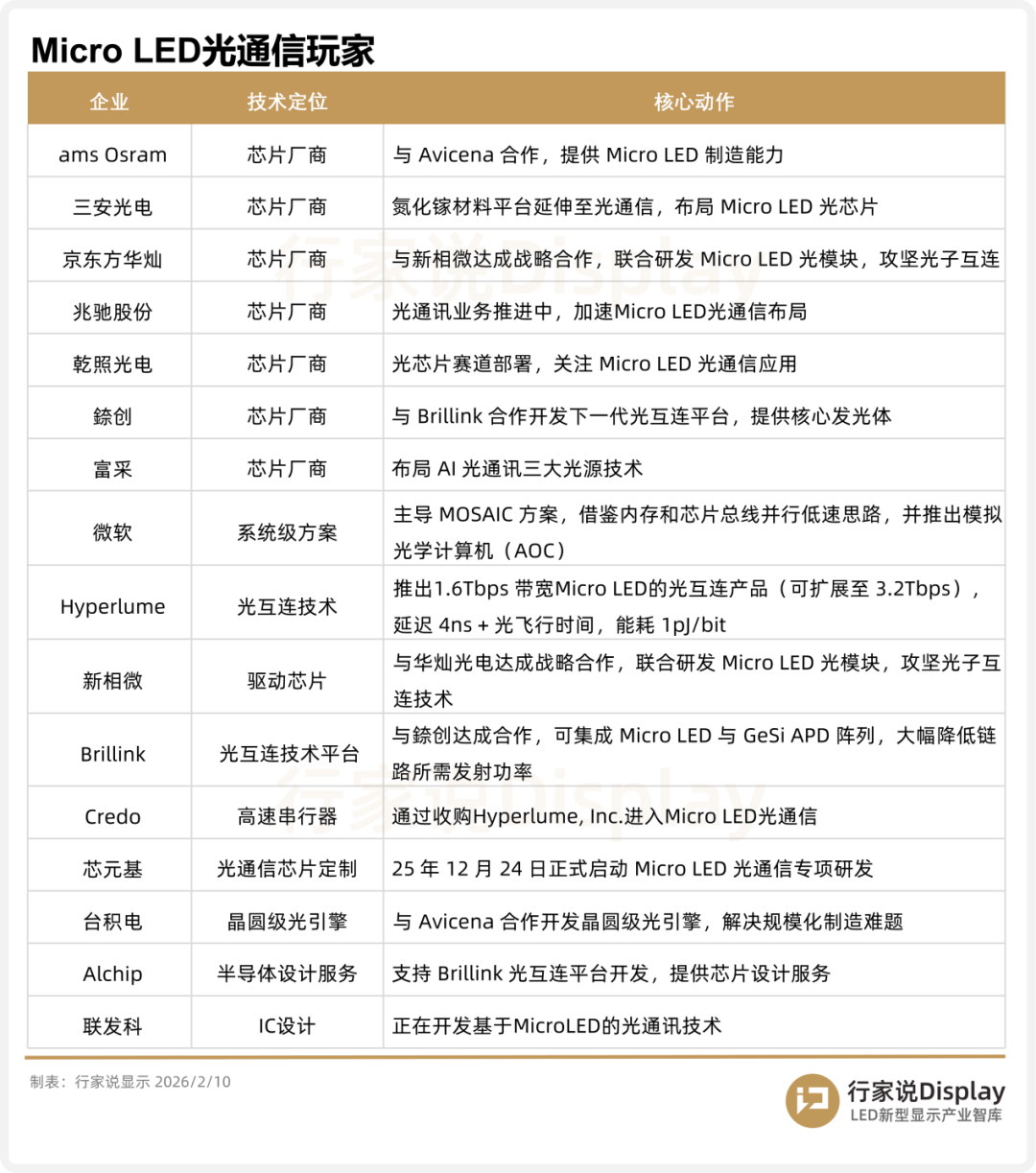 值得注意的是,中国台湾地区产业链已在该领域悄然形成协同态势。台积电已于2025年与美国初创企业Avicena合作,共同开发基于Micro LED的光学互连方案,其中台积电主要负责CMOS接收器整合与封装环节。联发科亦采用台积电COUPE先进封装平台进行方案开发。此外,联钧、华星光、光圣等台厂也已配合国际客户投入相关产品制造。