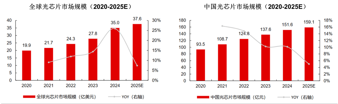 中商产业研究院数据显示,2024 年全球光芯片市场规模约 35 亿美元,2025 年预计增至 37.6 亿美元;中国光芯片市场 2024 年规模约 151.6 亿元,2025 年预计提升至 159.1 亿元。